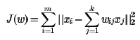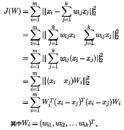 在寻找到某个样本的xi的k个最近邻之后需要找到找到xi和这k个最近邻之间的线性关系,也就是要找到线性关系的权重系数。找线性关系,这显然是一个回归问题。假设我们有m个n维样本{x1,x2,...,xm},可以用均方差作为回归问题的损失函数:即: