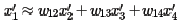 其中w12,w13,w14为权重系数。在通过LLE降维后,希望x1在低维空间对应的投影x1′,同时x2,x3,x4对应的投影x2′,x3′,x4′也尽量保持同样的线性关系,即