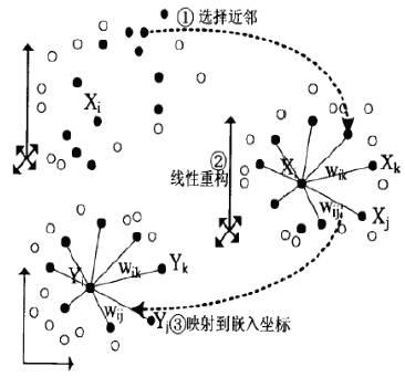 从图中可以看出,LLE算法主要分为三步,第一步是求K近邻的过程,这个过程使用了和KNN算法一样的求最近邻的方法;第二步,就是对每个样本求它在邻域里的K个近邻的线性关系,得到线性关系权重系数W;第三步就是利用权重系数来在低维里重构样本数据。