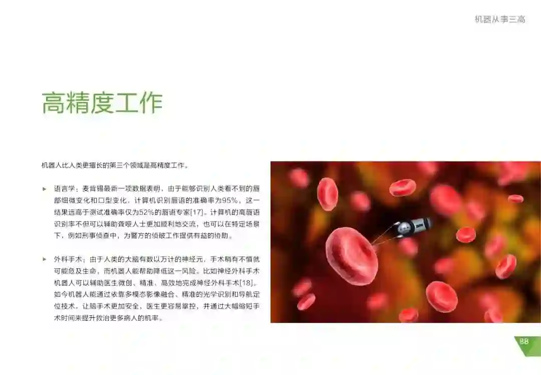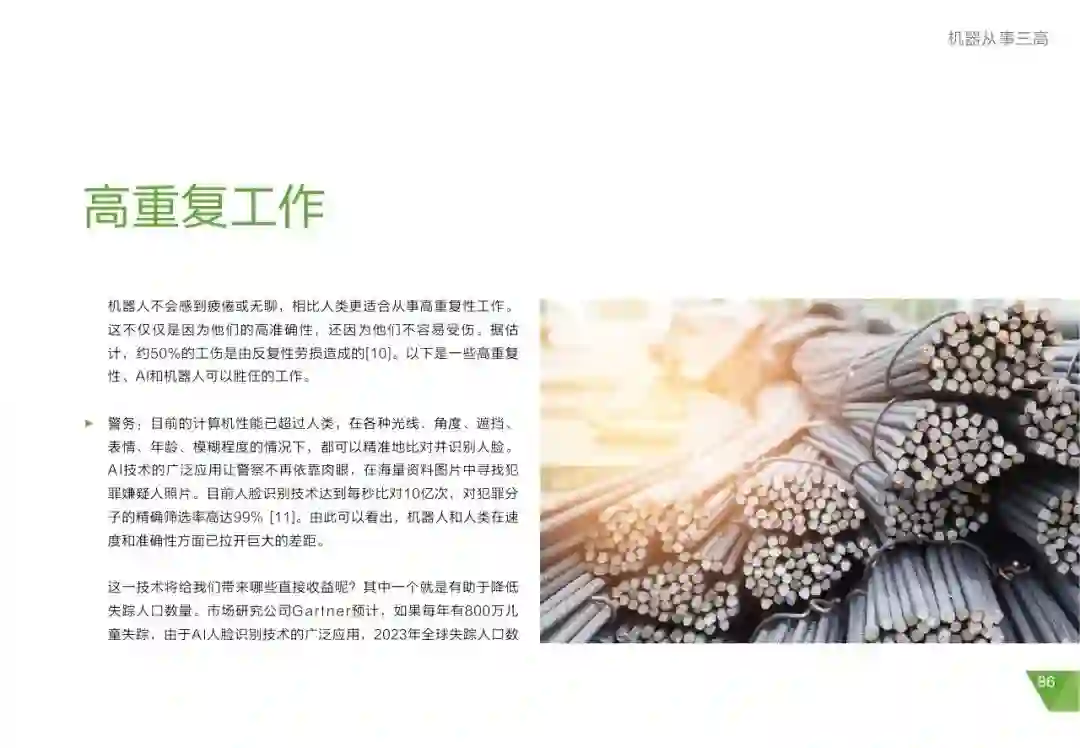 自动化和机器人,特别是人工智能机器人,正在改变我们的生活和工作方式,他们可以从事处理高危险、高重复性和高精度的工作,无需休息,也不会犯错,将极大提高生产力和安全性。