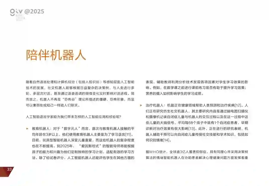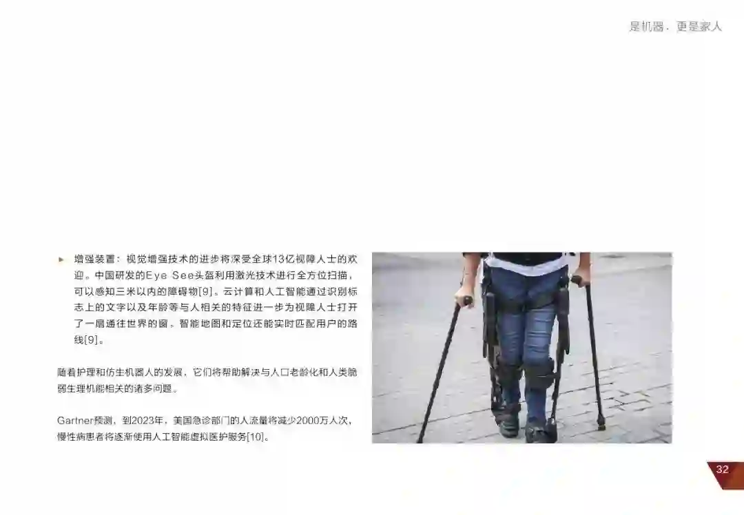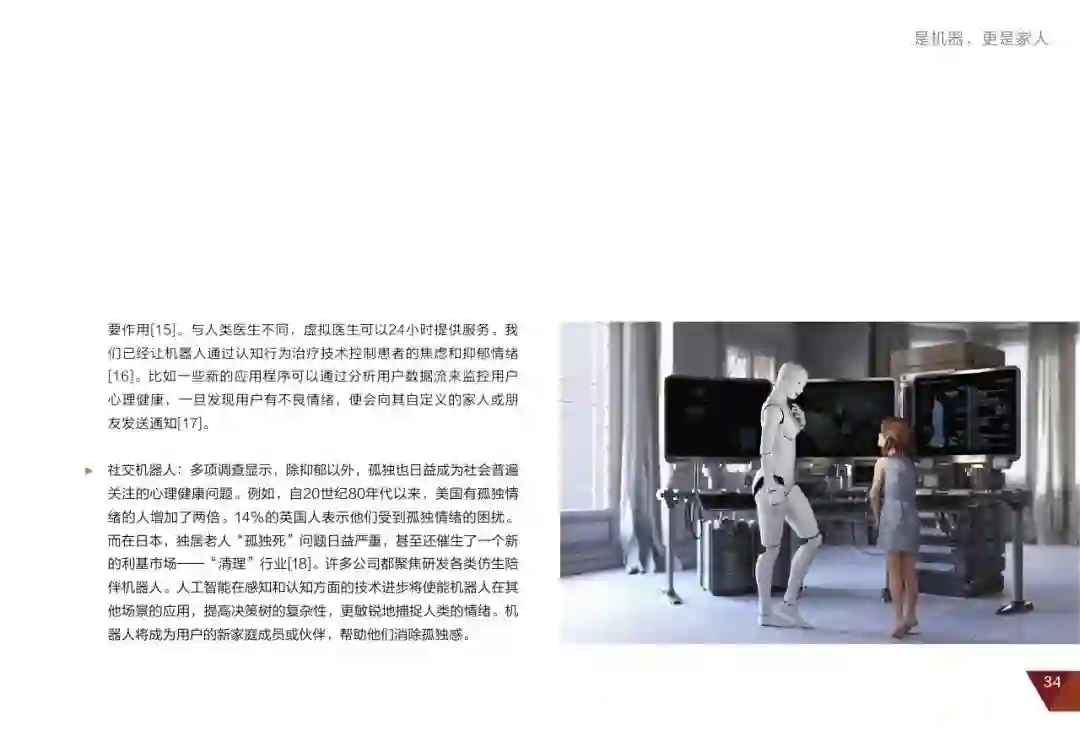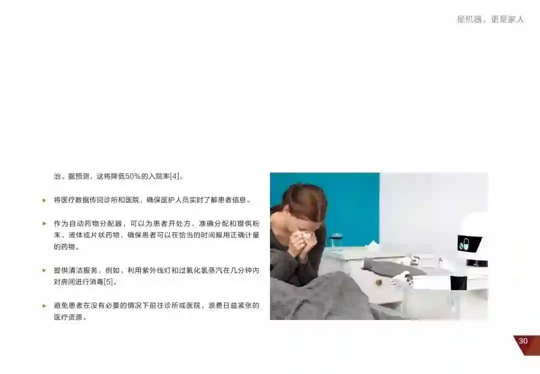 随着材料科学、感知人工智能以及5G、云等网络技术的不断进步,将出现护理机器人、仿生机器人、社交机器人、管家机器人等形态丰富的机器人,涌现在家政、教育、健康服务业,带给人类新的生活方式。
