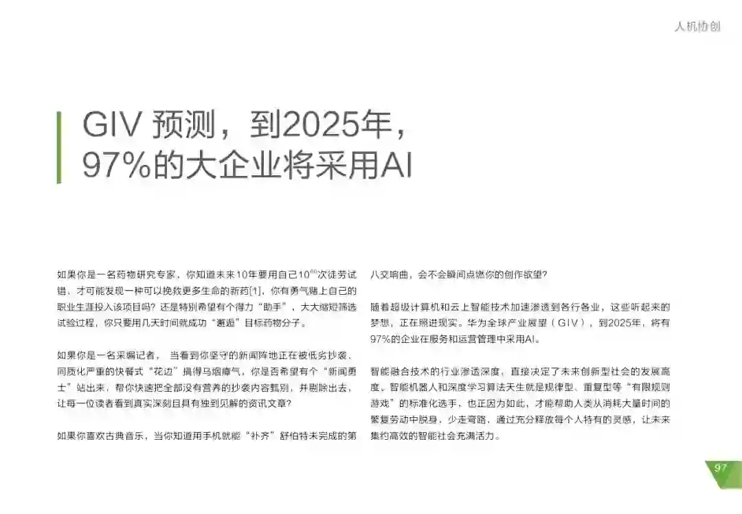 华为近日发布全球产业展望GIV@2025,提出智能世界正在加速而来,触手可及,并预测:到2025年,智能技术将渗透到每个人、每个家庭、每个组织,全球58%的人口将能享有5G网络,14%的家庭拥有“机器人管家”,97%的大企业采用AI。