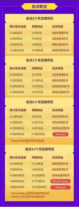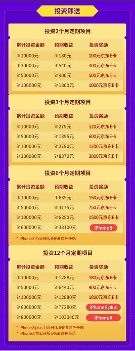 4、活动期间累计投资额满足所列投资标的类型及投资额(新手专享及活期日息宝除外),即可获得对应奖励,每人限领取一档奖励;