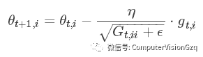 在前述中,每个模型参数θi使用相同的学习速率η,而Adagrad在每一个更新步骤中对于每一个模型参数θi使用不同的学习速率ηi,设第t次更新步骤中,目标函数的参数θi梯度为gt,i,即: