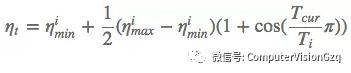 SGDR(Loshchilov andHutter,2017)是近期提出的一个有效的方法,这是一种使用热重启替代学习速率退火的SGD方法。在每次重新启动时,学习速率被初始化为某个值,并且将减少。重要的是,重启是热重启,因为优化不是从头开始,而是从最后一个步骤中模型收敛的参数开始。关键因素是用积极的余弦退火方案使学习率下降,这会迅速降低学习率,如下所示: