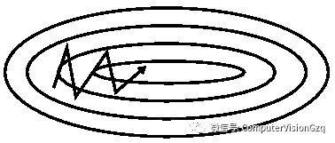 随机梯度下降最大的缺点在于每次更新可能并不会按照正确的方向进行,因此可以带来优化波动,如下图: