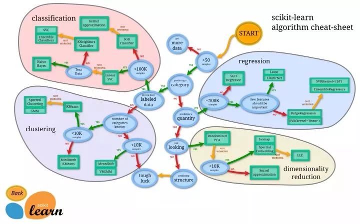 幸好,Python上的机器学习工具包 scikit-learn 不仅给我们提供了方便的接口,供我们调用,而且还非常贴心地帮我们做了小抄(cheat-sheet)。
