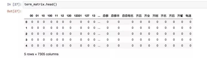 max_df = 0.8 # 在超过这一比例的文档中出现的关键词(过于平凡),去除掉。 min_df = 3 # 在低于这一数量的文档中出现的关键词(过于独特),去除掉。 vect = CountVectorizer(max_df = max_df, min_df = min_df, token_pattern=u'(?u)\\b[^\\d\\W]\\w+\\b', stop_words=frozenset(stopwords))
