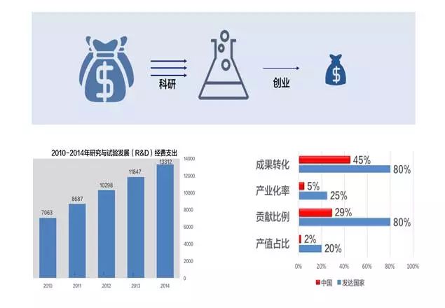 2015年中国科研经费的投入是1.4万亿,占全球科研经费的20%,科研经费仅次于美国,排全球第二,中国科研人员的数量已经达到全球第一。但我们面临的非常大的问题是,大量科研投入产生了巨量的科技成果,但是从科技成果到产业化却存在着“肠梗阻”,大多数科研成果没能成功转化为对经济有贡献的力量。因为我国的科技成果转换率非常低,发达国家科技成果产业化率为25%,我们只有5%,成果转化率发达国家达到80%,我们只有45%。