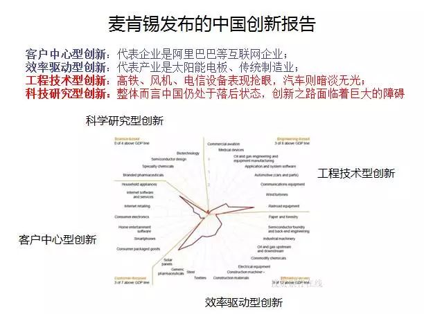 中国经济的两大战略,第一个战略就是互联网+战略,我认为这个战略属于麦肯锡提到的以客户驱动型创新和效率驱动型创新。第二个战略是中国制造的工程创新和科技创新。中国在互联网+方面已经走在了世界前列,现在最缺的是工程创新和科技创新。