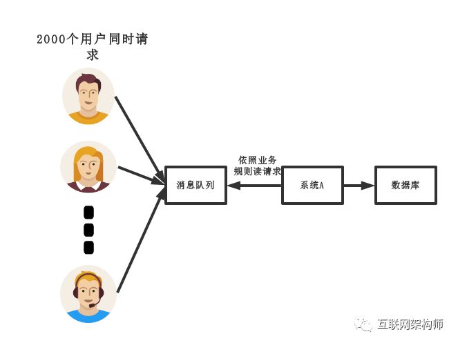 系统A慢慢的按照数据库能处理的并发量,从消息队列中慢慢拉取消息。在生产中,这个短暂的高峰期积压是允许的。