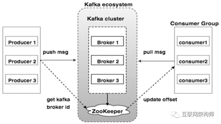 那么kafka呢,为了对比说明直接上kafka的拓补架构图(也是找的,懒得画)