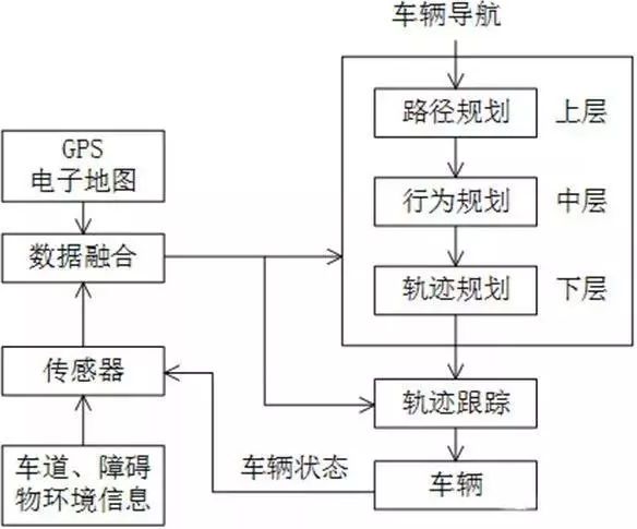 汽车自动驾驶任务可以分为三层,如下图所示,每层执行不同任务,包括上层路径规划、中层行驶行为规划和下层轨迹规划。车辆路径规划问题中还包括路网模型、路径规划算法和交通信息的智能预测这几个关键点,下文主要针对决策层中路径规划算法做简单探讨。