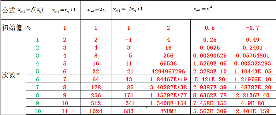 对于一次函数,如果系数大于1,则迭代结果越来越大,反之,对于 ,不管初始值在哪里,10 次迭代后都接近 10,如果类比上面的等比数列,一次函数的斜率可近似看做等比数列的公比,这里注意,一次函数中如果有常数项,则不是等比数列。但我们仍可以近似理解为比例,因为当