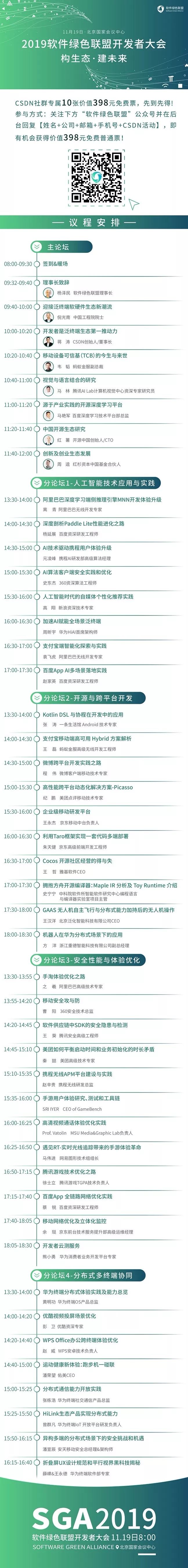 11月19日,由软件绿色联盟主办,阿里巴巴、腾讯、百度、网易、华为五家企业协办的第二届“软件绿色联盟开发者大会”将于11月19日北京国家会议中心举行,大会以“构生态 建未来”为主题,覆盖人工智能、分布式技术、开源、跨平台开发、安全、性能等时下最热门技术,邀请你与2000+开发者共享一场技术盛宴。