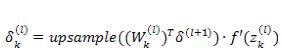 式中 k 是卷积核(filter)的下标, 是激活函数的导数,这里为了方便并没用写是对激活函数的参数进行求导,实际上对参数求导的话会再多一项激活函数输入向量 x ,从而得到维度一样的向量,并可以进行按位乘操作。upsample 操作是池化操作的反向过程,如果是 mean pooling ,就把误差项均匀传递到所有的池化层输入节点上;如果是 max pooling ,就把误差项直接传递给产生 max 值的这个输入节点上。