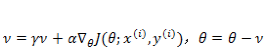 SGD 训练过程中另外一个需要注意的问题是如果目标函数在最优解附近有抖动,而且具有局部很陡的峰值,那么常规 SGD 会在局部峰值的位置震荡。很不幸 DNN 就具有这样的特点。一个解决办法是在梯度更新的时候增加动量: