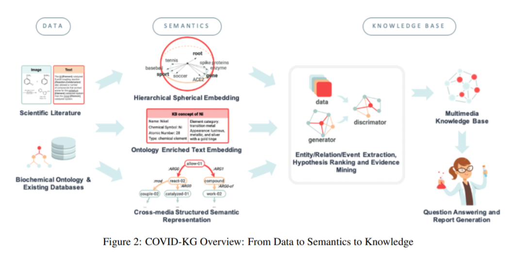 为了对抗COVID-19,临床医生和科学家都需要查阅大量相关的文献生物医学知识,了解其发病机制和相关的生物学功能。我们开发了全新的、全面的知识发现框架COVID-KG,它利用新的语义表示和外部本体来表示输入文献数据中的文本和图像,然后进行各种提取组件来提取细粒度的多媒体知识元素(实体、关系和事件)。然后,我们利用构建的多媒体信息库进行问题回答和报告生成,并以药物再利用作为案例研究。我们的框架还提供了详细的上下文句子、子图和知识子图作为证据。所有数据、KGs、资源和共享服务都是公开可用的。