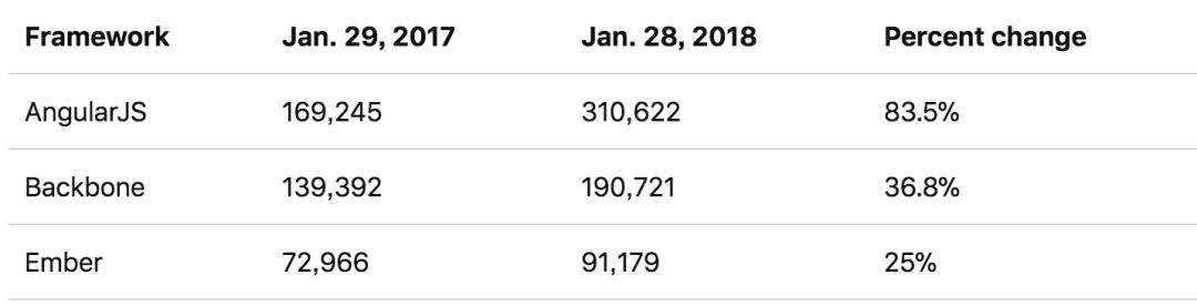 有意思的是,你会发现 AngularJS 实际上比 Vue 的下载量更高。Vue 在去年年底超过了 AngularJS ,但在今年 1 月的最新数据中,AngularJS 出现了较大的波动。当然,这不会影响 Vue 的长期趋势。