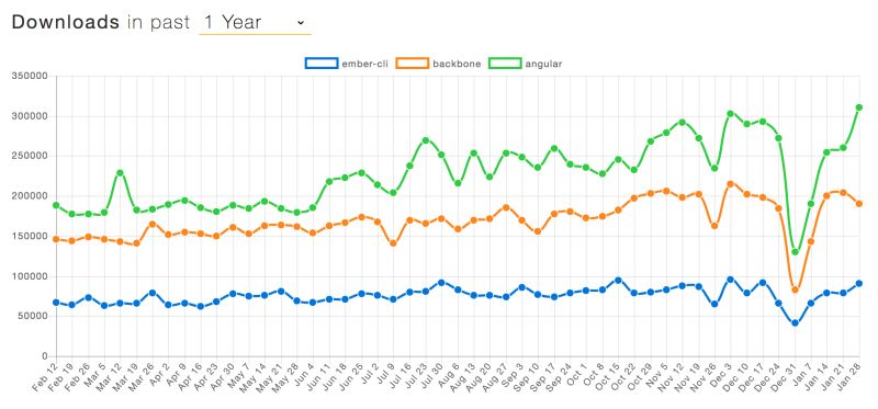 Javascriptreport 近日发布了一篇文章来比较流行前端框架的走势。走势图是通过统计最新的数据,并与前一年的数据进行比较而生成。数据来源于 npm trends 的每日下载量。