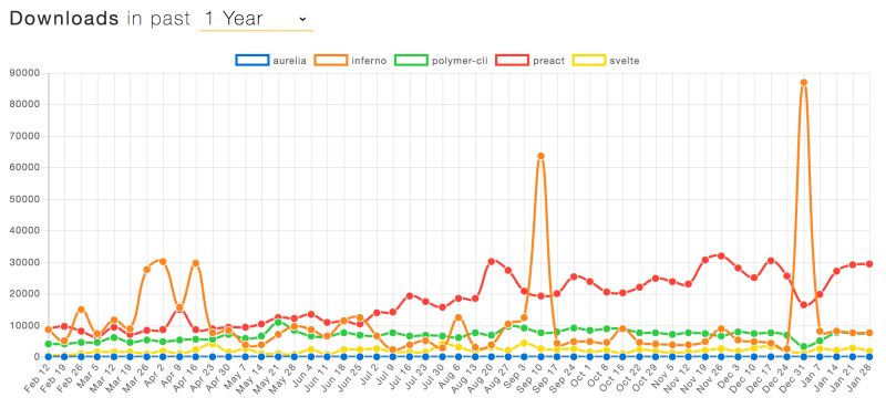 下面同样是非常优秀的一组框架对比:Preact、Inferno、Aurelia、Polymer 和 Svelte 。