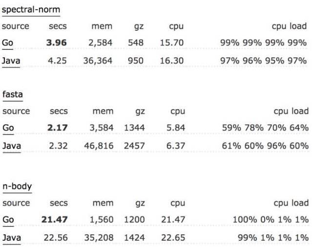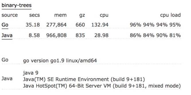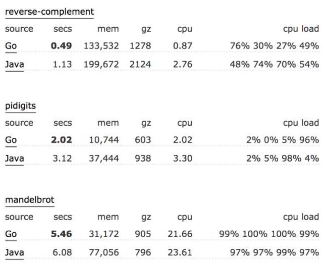 Go 极其地快,其性能与 Java 或 C++ 相似。在我们的使用中,Go 一般比 Python 要快 30 倍。以下是 Go 与 Java 之间的基准比较: