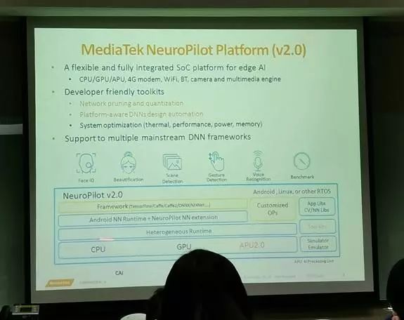 在这次的沟通会上,吴骅表示Neuropilot接下来会进入到2.0时代,这个平台是整个SOC,包括了硬件和ToolKits。其中硬件部分既包括传统的CPU、GPU,也包括AI加速芯片APU 2.0,能够让AI应用更加丰富。