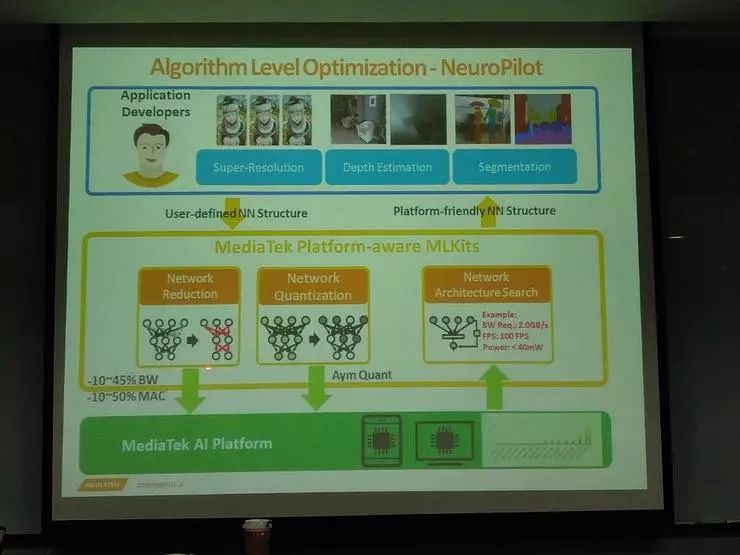吴骅重点介绍了NeuroPilot 2.0相对前代的改进,联发科在NeuroPilot 2.0平台上提供了ML Kit,可以对神经网络进行剪枝和量化,经过Quant(量化分析),可以节省35%的运算量和25%~30%的带宽,同时准确度并不会下降。