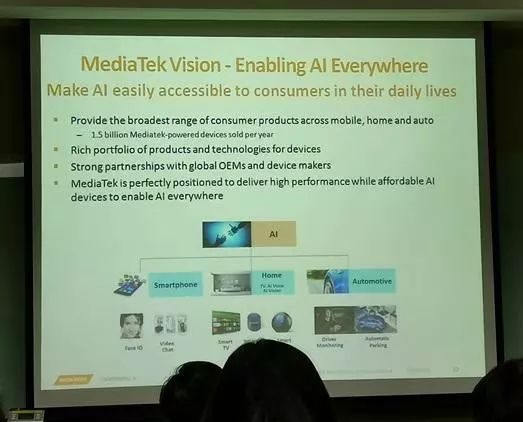 吴骅还介绍称,联发科对AI技术的规划首先是将AI技术运用到智能手机中,之后会扩展到家庭,包括利用AI技术改善电视影像质量或者提升智能音箱的语音识别能力,最后是将AI技术放到汽车领域。“我们的愿景是希望把AI做到大家普及,每一个领域或多或少有AI的影子,让我们的生活更丰富。”
