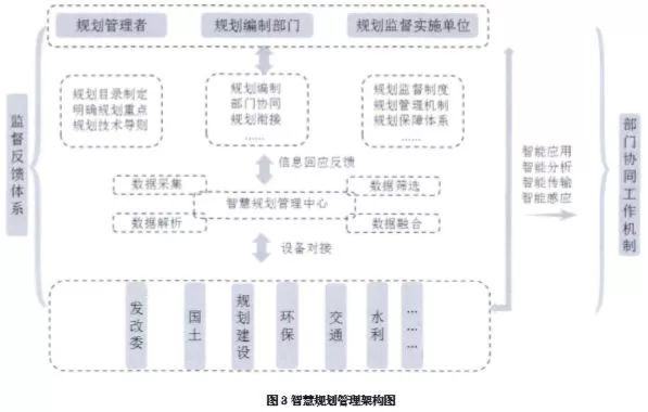 如规划管理者,基于智慧规划管理中心的信息共享、基础数据图的共用上,进行规划目录的编制、规划重点的明确,以及规划技术导则的制定等等,减少不必要的规划,避免规划中不必要的重复操作。规划编制部门对各类规划进行有序的编制,并且在智慧管理中心的信息反馈基础上,协调各部门各规划之间不衔接的地方,并进行修正、修订等。规划监督实施者完善规划实施监督机制、建立规划保障标准等。各个部门通过这种双向的沟通,规划管理不仅井然有序的进行,还可以根据信息数据的回应反馈实现动态调整。