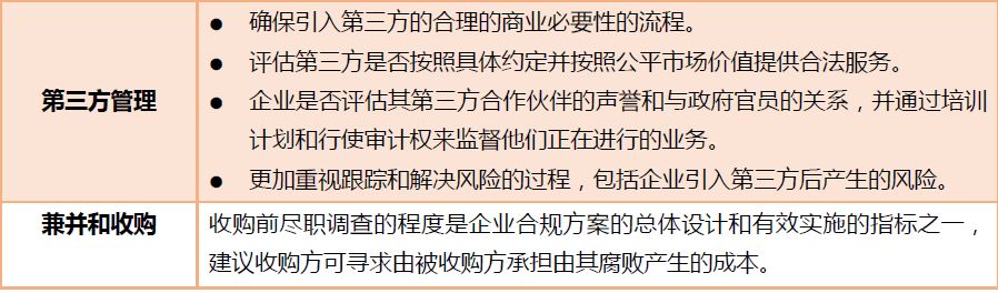 该指引规定,合规方案的设计应包括对不当行为的零容忍、明确的政策和流程、适当的责任分配、培训计划以及激励和惩戒措施。方案设计必须针对公司的具体情况进行风险定制,并充分关注高风险领域,而不是过度关注低风险领域。例如,“精心设计的合规方案应包括对任何收购目标的全面尽职调查”,特别是在收购前。