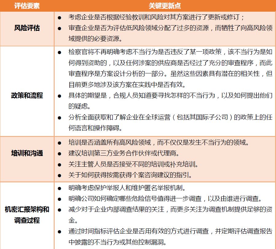 至关重要的是,该指南还包括一个新的评估要素,即评估该公司是否有一个可以对不当行为指控和其他合规问题进行彻底和及时的调查的运作良好、资源充足的机制。这与合规方案设计有关的调查机制是有区别的。