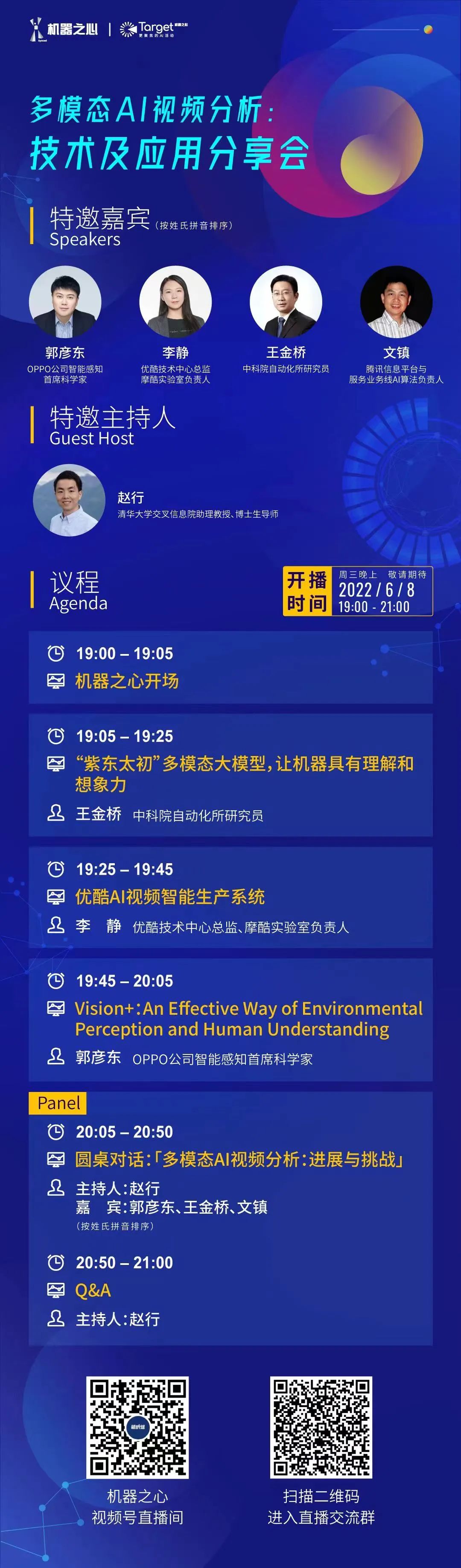 分享嘉宾与主题介绍 主题一:“紫东太初” 多模态大模型,让机器具有理解和想象力嘉宾简介:王金桥,中国科学院自动化研究所研究员,博士生导师,中国科学院大学人工智能学院教授。主要从事预训练大模型、目标检测与识别、视频分析与理解等方面的研究,共发表论 280 余篇,获得国内竞赛冠军 20 余项。 分享摘要:本次将介绍千亿参数多模态预训练大模型 “紫东太初”,它开拓性地实现了图像、文字、语音和视频等不同模态数据的统一表示和互相生成,兼具理解和生成认知能力,并实现了在媒体理解、人机对话等多场景的落地应用。 主题二:优酷 AI 视频智能生产系统 嘉宾简介:李静,博士,优酷技术中心总监,摩酷实验室负责人。法国南特大学计算机博士,曾任法国国家科学院研究员。2019 年加入阿里巴巴。研究方向多媒体视觉体验质量评价,3D 视觉,机器学习等。为多个国际、欧盟、国内专家组和标准组成员。参与制定多个 IEEE 以及 ITU 国际标准,担任多个国际期刊与会议主编以及评审。 分享摘要:优酷 AI 视频智能生产系统,基于自有 IP 版权内容,从视频、音频、弹幕等多模态信息中提取看点和标签,沉淀图片、镜头、片段级看点素材形成素材库,通过自研算法具备根据不同内容创作模板进行加工与视频剪辑合成的能力,同时可自动配合相应标题与封面图,满足人机配合高效创作精品、以及自动化批量生产满足优酷内容需求的分级智能生产系统。 主题三:Vision+:An Effective Way of Environmental Perception and Human Understanding 嘉宾简介:郭彦东,OPPO 公司智能感知首席科学家,对应技术委员会以及智能驾驶负责人,北京邮电大学兼职教授。郭博士致力于计算机视觉与人工智能的学术研究,也注重在工业界的应用。他的论文被广泛接收在 CVPR、ECCV 等国际认可的学术会议期刊,同行引用数千次,赋能了 GE、HP、Microsoft、小鹏汽车、OPPO 等公司的多款核心产品。 分享摘要:OPPO 讨论了视觉信号与其他模态的信号融合的不同方式,包括声音、文字、激光雷达,以及多路视频的相互融合方式。通过场景化的设计具有融合作用的神经网络架构,实验展示了视觉信号可以融合其他模态来提高识别效果,也可以与文字一起进行有效的联合预先训练(特别是分割场景),多路视觉信号对于 3D 立体重建,特别是人体重建,有非常好的效果。 圆桌对话嘉宾与主题介绍 圆桌对话主题:「多模态 AI 视频分析:进展与挑战」 特邀主持人: