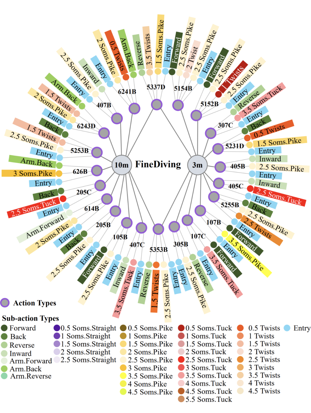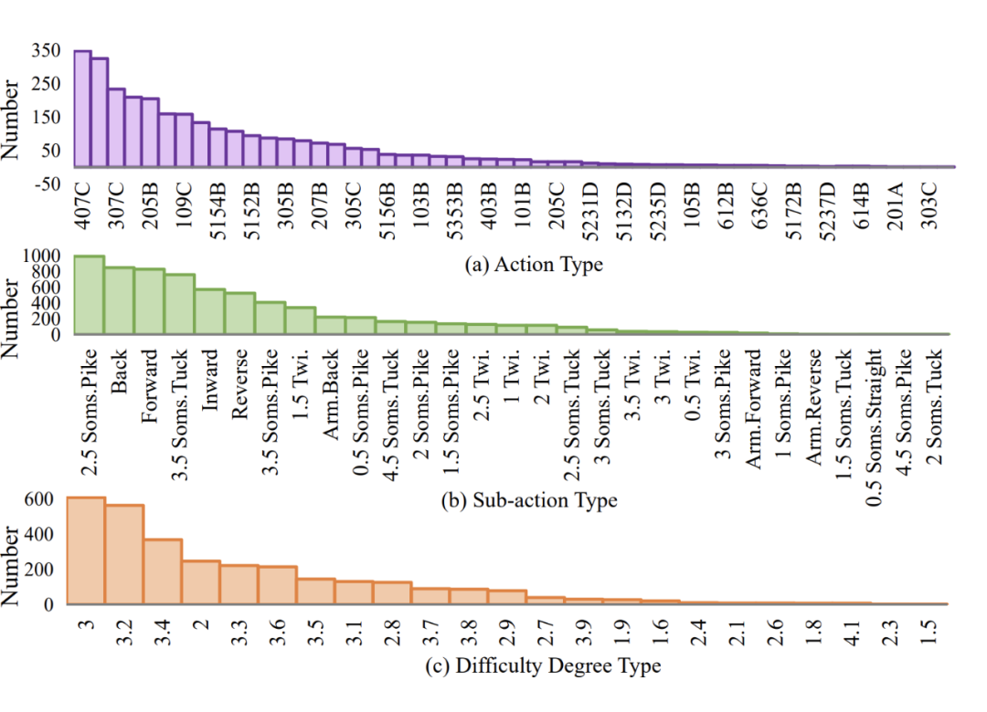 FineDiving 数据集包含 3000 个样本,涵盖 52 种 action types、29 种 sub-action types 以及 23 种难度难度系数,如图(4)所示。