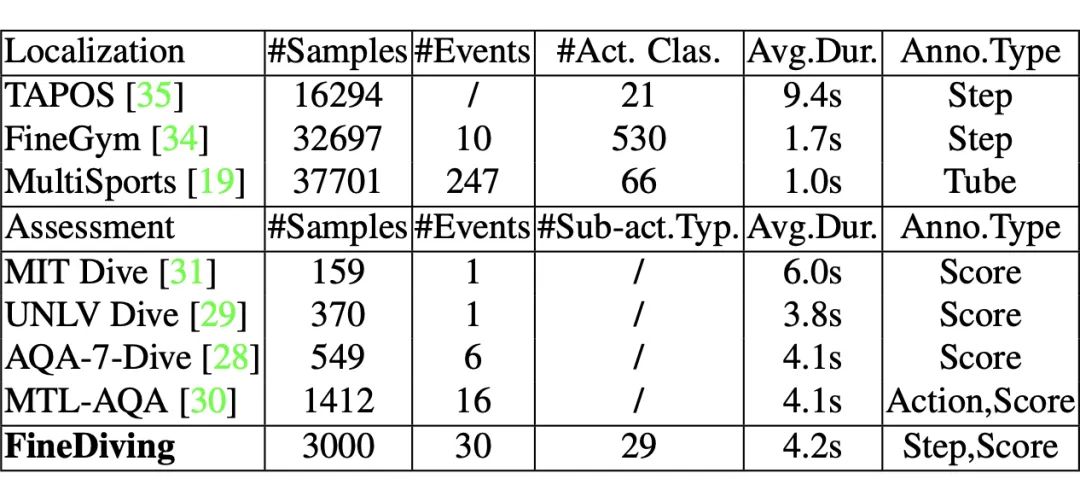 ▲(5)Comparison of existing sports video datasets and Fine-Diving. Score表示动作得分; Step表示细粒度的类别和时间边界; Action表示粗粒度的类别和时间边界; Tube包含细粒度的类别、时间边界以及空间定位。