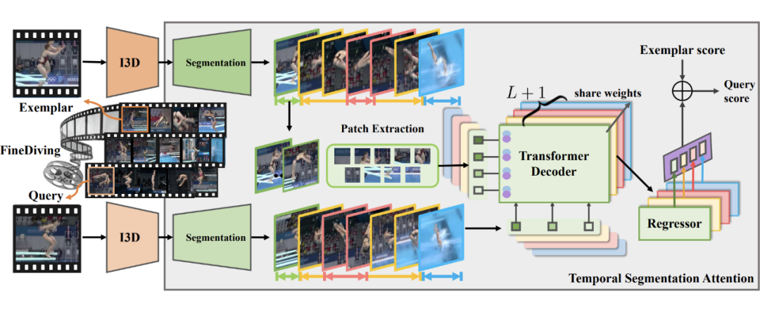 我们进一步提出一种过程感知方法来评估动作质量,通过构建一个新的时间分割注意模块(Temporal Segmentation Attention,TSA),以可解释的方式评估动作得分。TSA 包含三个部分:动作过程分割(procedure segmentation),过程感知交叉注意(procedure-aware cross-attention)以及细粒度对比回归(fine-grained contrastive regression)。