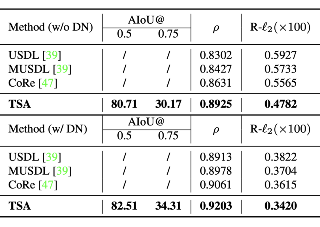我们的方法(TSA)与其他 AQA 方法的对比结果(见表(7))。