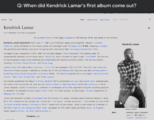 开放域问答(QA)是自然语言理解(NLU)中的一项基准任务,旨在模拟人们如何寻找信息,通过阅读和理解整个文档来找到问题的答案。给出一个用自然语言表达的问题(「为什么天空是蓝色的?」)一个问答系统应该能够阅读网页(比如这个维基百科页面)并返回正确的答案,即便这个答案有点复杂和冗长。然而,目前还没有大量公开的可用于训练和评估问答模型的自然生成问题(如人们寻求信息时提出的问题)及答案。这是因为,为了回答问题而收集一个高质量的数据集,不仅需要大量真实的问题源,还需要大量的人力才能找到正确的答案。