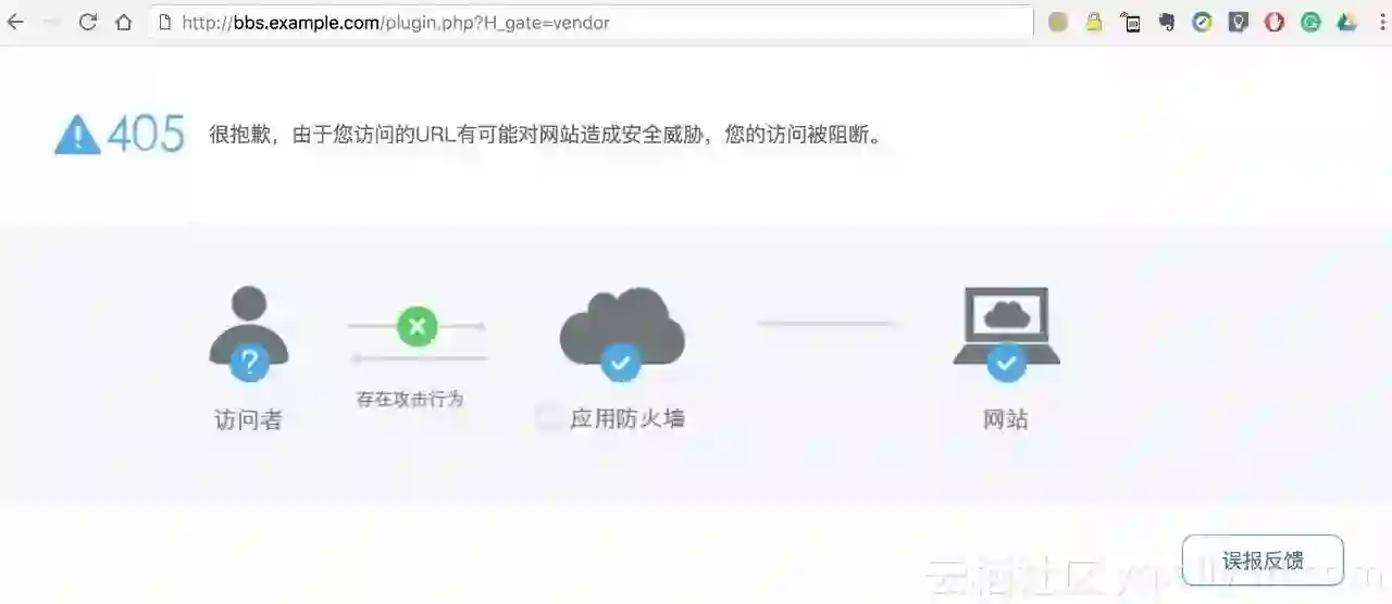 完成WAF配置后,访问触发漏洞的URL:http://bbs.example.com/plugin.php?H_gate=vendor ,浏览器直接提示访问请求已经被阿里云WAF拦截,bingo!