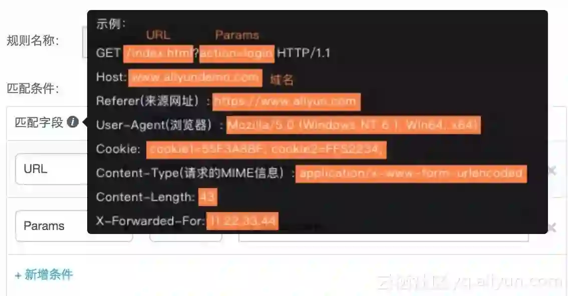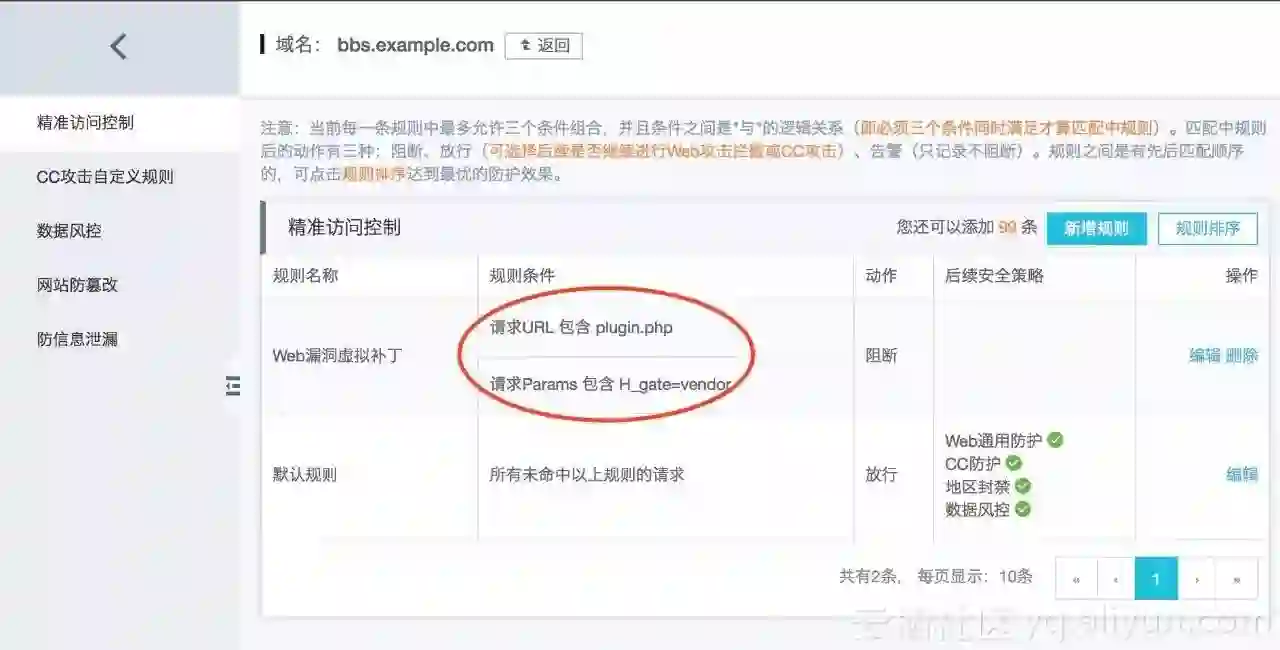 进入配置界面,直接点击【新增规则】,在弹出的对话框中进行URL匹配及拦截配置。针对本次漏洞利用的关键URL:http://bbs.example.com/plugin.php?H_gate=vendor, 为降低拦截的误判率,设置规则如下: