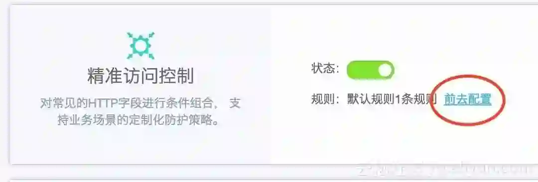 本次虚拟补丁配置需要用到【精准访问控制】,所以该功能务必处于开启状态。在该功能已经开启的前提下,点击超链接【前去配置】。