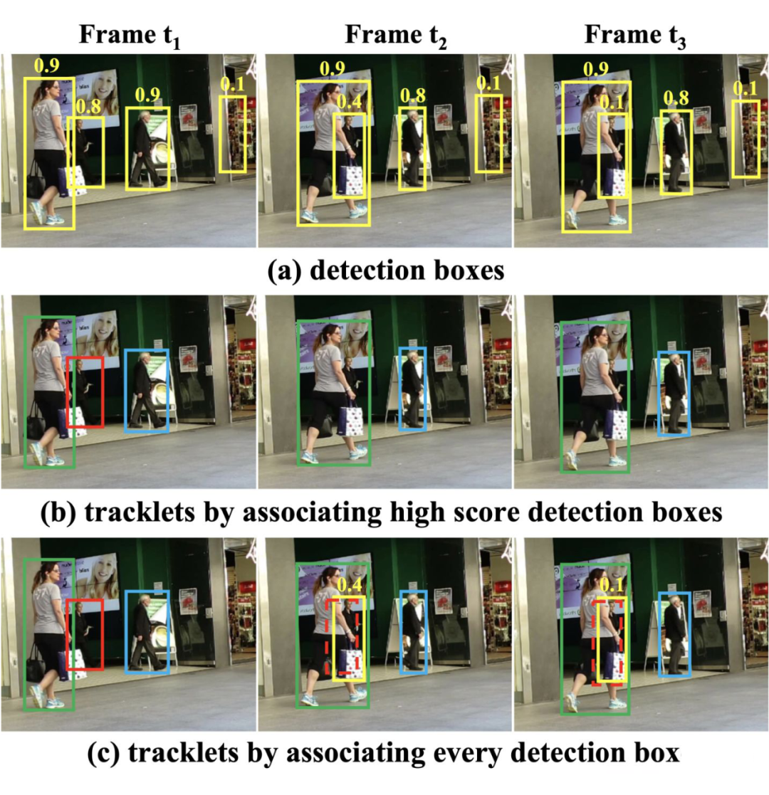 为了处理 true positive/false positive 的 trade-off,目前大部分 MOT 方法会选择一个阈值,只保留高于这个阈值的检测结果来做关联得到跟踪结果,低于这个阈值的检测结果直接丢弃。但是这样做合理吗?答案是否定的。黑格尔说过:“存在即合理。”低分检测框往往预示着物体的存在(例如遮挡严重的物体)。简单地把这些物体丢弃会给 MOT 带来不可逆转的错误,包括大量的漏检和轨迹中断,降低整体跟踪性能。