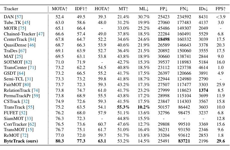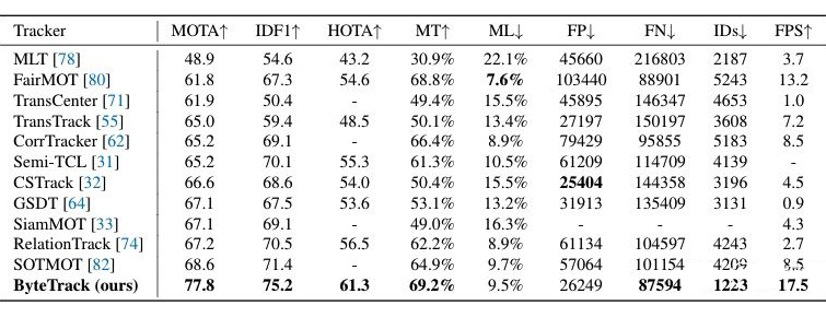 其次,我们将 BYTE 应用到了 ECCV20 之后的 9 种 SOTA tracker 上,其中包括基于 ReID, motion 和 attention 的方法,都得到了稳定的 MOTA 和 IDF1 指标的提升,结果如下表所示: