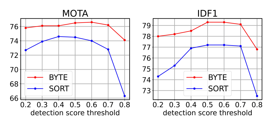 首先,我们使用 YOLOX 的检测结果,发现 BYTE 能够大幅领先 SORT,DeepSORT,MOTDT 等经典热门关联方法,对超参数也更加鲁棒,结果如下所示:
