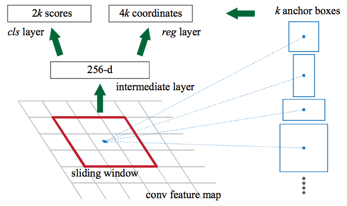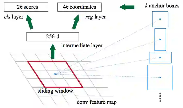 那么Region Proposal Network具体是如何工作的呢?首先,将CNN中得来的特征映射输入到Faster RCNN中,然后将其传递到Region Proposal Network中。RPN会在这些特征映射上使用一个滑动窗口,每个窗口会生成具有不同形状和尺寸的k个anchor box: