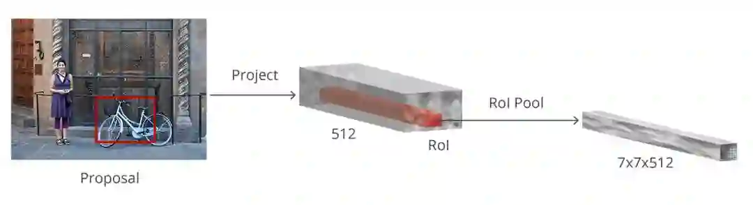 现在我们有了不同形状、尺寸的边界框,将它们传递到Rol池化层中。经过RPN的处理,proposals可能没有所述的类别。我们可以对每个proposal进行切割,让它们都含有目标物体。这就是Rol池化层的作用。它为每个anchor提取固定尺寸的特征映射: