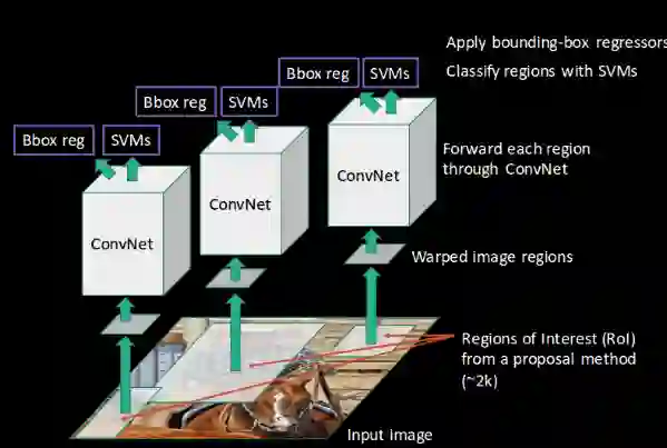 CNN为每个区域提取特征,利用SVM将这些区域分成不同类别: