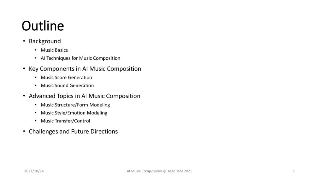 人工智能作曲是人工智能、音乐和多媒体领域最具吸引力和重要的课题之一。人工智能作曲的典型任务包括旋律生成、歌曲创作、伴奏生成、编曲、演奏生成、音色渲染、声音生成、歌唱声音合成等,涵盖了不同的形式(如象征性乐谱、声音等),与ACM多媒体的主题非常匹配。随着内容创作、深度学习等人工智能技术的快速发展,基于人工智能的音乐创作取得了快速的进步,但也遇到了很多挑战。对于从事人工智能、音乐和多媒体工作的广大听众来说,全面介绍和回顾人工智能作曲的基础知识、研究进展以及如何应对挑战是及时而必要的。在本教程中,我们将首先介绍人工智能作曲的背景,包括音乐基础知识和作曲深度学习技术。接下来我们将从两个方面介绍人工智能作曲:1)关键组件,包括乐谱生成、音乐表现生成和音乐声音生成;2)高级主题,包括音乐结构/形式/风格/情感建模,音色合成/转换/混音等。最后,提出了人工智能作曲的一些研究挑战和未来发展方向。本教程既适用于从事人工智能作曲的学术研究人员,也适用于从事人工智能作曲的行业从业者。