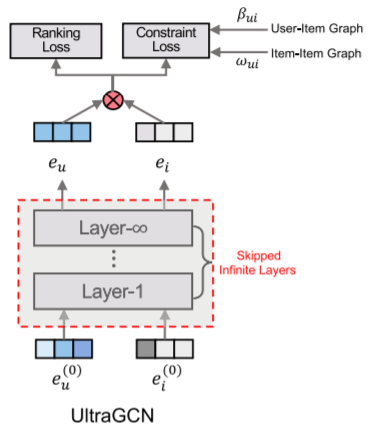 UltraGCN总体框架如图所示,是一个多任务的形式,包含主损失和两个辅助损失。
