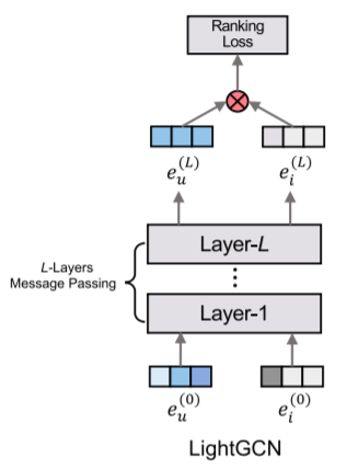 如上式所示为lightGCN的每一层的计算方式,它直接聚合这些节点而不采用可学习权重和激活函数。其中u表示用户,i表示item,N(u)表示用户邻接的item集合,N(i)表示item邻接的user的集合,d表示节点的度。如上图所示,LightGCN是通过多层layer堆叠进行多层次的消息传递,从而进行节点之间的聚合,最后将两者的embedding求内积。但是这种堆叠的方式会影响基于GCN的推荐系统的训练效率和效果。以第